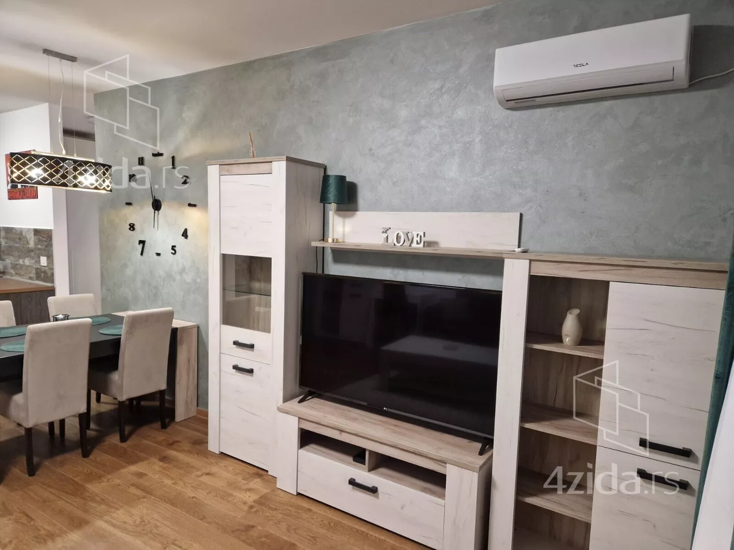 The furniture and appliances are new, and the kitchen is custom-made: fridge with freezer, extractor hood, built-in oven, cooktop, dishwasher. The air conditioner is installed in the living room. The bathroom has a washing machine, Flat Smart Wi-Fi boiler, and shower cabin. The apartment has two Flat Smart TVs, one in the living room and one in the bedroom.